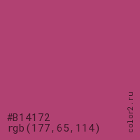 Цвет #B14172 в цветовой модели RGB обозначается тремя октетами (177, 65, 114) в десятичном формате и #B14172 в шестнадцатиричном (hex) формате, которые являются интенсивностью красного 177 (hex B1), интенсивность зелёного 65 (hex 41) и интенсивность синего 114 (hex 72).