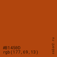 Цвет #B1450D в цветовой модели RGB обозначается тремя октетами (177, 69, 13) в десятичном формате и #B1450D в шестнадцатиричном (hex) формате, которые являются интенсивностью красного 177 (hex B1), интенсивность зелёного 69 (hex 45) и интенсивность синего 13 (hex 0D).