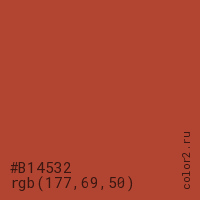 Цвет #B14532 в цветовой модели RGB обозначается тремя октетами (177, 69, 50) в десятичном формате и #B14532 в шестнадцатиричном (hex) формате, которые являются интенсивностью красного 177 (hex B1), интенсивность зелёного 69 (hex 45) и интенсивность синего 50 (hex 32).