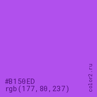 Цвет #B150ED в цветовой модели RGB обозначается тремя октетами (177, 80, 237) в десятичном формате и #B150ED в шестнадцатиричном (hex) формате, которые являются интенсивностью красного 177 (hex B1), интенсивность зелёного 80 (hex 50) и интенсивность синего 237 (hex ED).