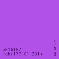 Цвет #B151E7 в цветовой модели RGB обозначается тремя октетами (177, 81, 231) в десятичном формате и #B151E7 в шестнадцатиричном (hex) формате, которые являются интенсивностью красного 177 (hex B1), интенсивность зелёного 81 (hex 51) и интенсивность синего 231 (hex E7).