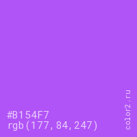 Цвет #B154F7 в цветовой модели RGB обозначается тремя октетами (177, 84, 247) в десятичном формате и #B154F7 в шестнадцатиричном (hex) формате, которые являются интенсивностью красного 177 (hex B1), интенсивность зелёного 84 (hex 54) и интенсивность синего 247 (hex F7).