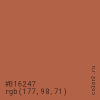 Цвет #B16247 в цветовой модели RGB обозначается тремя октетами (177, 98, 71) в десятичном формате и #B16247 в шестнадцатиричном (hex) формате, которые являются интенсивностью красного 177 (hex B1), интенсивность зелёного 98 (hex 62) и интенсивность синего 71 (hex 47).