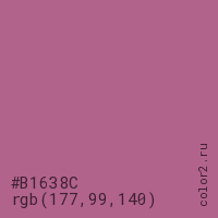 Цвет #B1638C в цветовой модели RGB обозначается тремя октетами (177, 99, 140) в десятичном формате и #B1638C в шестнадцатиричном (hex) формате, которые являются интенсивностью красного 177 (hex B1), интенсивность зелёного 99 (hex 63) и интенсивность синего 140 (hex 8C).