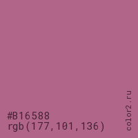 Цвет #B16588 в цветовой модели RGB обозначается тремя октетами (177, 101, 136) в десятичном формате и #B16588 в шестнадцатиричном (hex) формате, которые являются интенсивностью красного 177 (hex B1), интенсивность зелёного 101 (hex 65) и интенсивность синего 136 (hex 88).