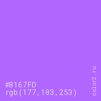 Цвет #B167FD в цветовой модели RGB обозначается тремя октетами (177, 103, 253) в десятичном формате и #B167FD в шестнадцатиричном (hex) формате, которые являются интенсивностью красного 177 (hex B1), интенсивность зелёного 103 (hex 67) и интенсивность синего 253 (hex FD).