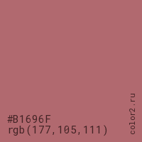 Цвет #B1696F в цветовой модели RGB обозначается тремя октетами (177, 105, 111) в десятичном формате и #B1696F в шестнадцатиричном (hex) формате, которые являются интенсивностью красного 177 (hex B1), интенсивность зелёного 105 (hex 69) и интенсивность синего 111 (hex 6F).