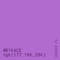 Цвет #B16ACE в цветовой модели RGB обозначается тремя октетами (177, 106, 206) в десятичном формате и #B16ACE в шестнадцатиричном (hex) формате, которые являются интенсивностью красного 177 (hex B1), интенсивность зелёного 106 (hex 6A) и интенсивность синего 206 (hex CE).