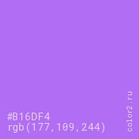 Цвет #B16DF4 в цветовой модели RGB обозначается тремя октетами (177, 109, 244) в десятичном формате и #B16DF4 в шестнадцатиричном (hex) формате, которые являются интенсивностью красного 177 (hex B1), интенсивность зелёного 109 (hex 6D) и интенсивность синего 244 (hex F4).