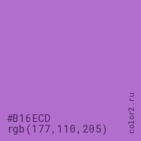 Цвет #B16ECD в цветовой модели RGB обозначается тремя октетами (177, 110, 205) в десятичном формате и #B16ECD в шестнадцатиричном (hex) формате, которые являются интенсивностью красного 177 (hex B1), интенсивность зелёного 110 (hex 6E) и интенсивность синего 205 (hex CD).