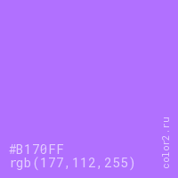 Цвет #B170FF в цветовой модели RGB обозначается тремя октетами (177, 112, 255) в десятичном формате и #B170FF в шестнадцатиричном (hex) формате, которые являются интенсивностью красного 177 (hex B1), интенсивность зелёного 112 (hex 70) и интенсивность синего 255 (hex FF).