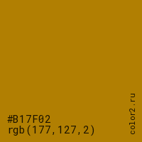Цвет #B17F02 в цветовой модели RGB обозначается тремя октетами (177, 127, 2) в десятичном формате и #B17F02 в шестнадцатиричном (hex) формате, которые являются интенсивностью красного 177 (hex B1), интенсивность зелёного 127 (hex 7F) и интенсивность синего 2 (hex 02).