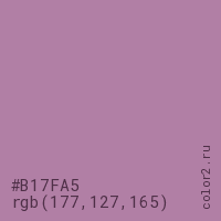 Цвет #B17FA5 в цветовой модели RGB обозначается тремя октетами (177, 127, 165) в десятичном формате и #B17FA5 в шестнадцатиричном (hex) формате, которые являются интенсивностью красного 177 (hex B1), интенсивность зелёного 127 (hex 7F) и интенсивность синего 165 (hex A5).