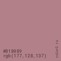 Цвет #B18089 в цветовой модели RGB обозначается тремя октетами (177, 128, 137) в десятичном формате и #B18089 в шестнадцатиричном (hex) формате, которые являются интенсивностью красного 177 (hex B1), интенсивность зелёного 128 (hex 80) и интенсивность синего 137 (hex 89).