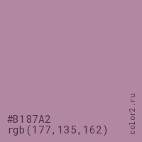 Цвет #B187A2 в цветовой модели RGB обозначается тремя октетами (177, 135, 162) в десятичном формате и #B187A2 в шестнадцатиричном (hex) формате, которые являются интенсивностью красного 177 (hex B1), интенсивность зелёного 135 (hex 87) и интенсивность синего 162 (hex A2).