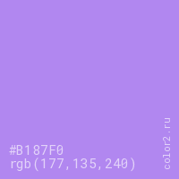 Цвет #B187F0 в цветовой модели RGB обозначается тремя октетами (177, 135, 240) в десятичном формате и #B187F0 в шестнадцатиричном (hex) формате, которые являются интенсивностью красного 177 (hex B1), интенсивность зелёного 135 (hex 87) и интенсивность синего 240 (hex F0).