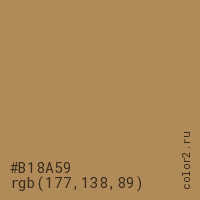 Цвет #B18A59 в цветовой модели RGB обозначается тремя октетами (177, 138, 89) в десятичном формате и #B18A59 в шестнадцатиричном (hex) формате, которые являются интенсивностью красного 177 (hex B1), интенсивность зелёного 138 (hex 8A) и интенсивность синего 89 (hex 59).