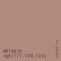 Цвет #B18A7D в цветовой модели RGB обозначается тремя октетами (177, 138, 125) в десятичном формате и #B18A7D в шестнадцатиричном (hex) формате, которые являются интенсивностью красного 177 (hex B1), интенсивность зелёного 138 (hex 8A) и интенсивность синего 125 (hex 7D).