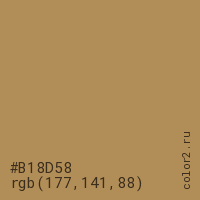 Цвет #B18D58 в цветовой модели RGB обозначается тремя октетами (177, 141, 88) в десятичном формате и #B18D58 в шестнадцатиричном (hex) формате, которые являются интенсивностью красного 177 (hex B1), интенсивность зелёного 141 (hex 8D) и интенсивность синего 88 (hex 58).