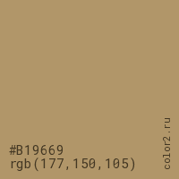 Цвет #B19669 в цветовой модели RGB обозначается тремя октетами (177, 150, 105) в десятичном формате и #B19669 в шестнадцатиричном (hex) формате, которые являются интенсивностью красного 177 (hex B1), интенсивность зелёного 150 (hex 96) и интенсивность синего 105 (hex 69).