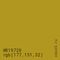 Цвет #B19720 в цветовой модели RGB обозначается тремя октетами (177, 151, 32) в десятичном формате и #B19720 в шестнадцатиричном (hex) формате, которые являются интенсивностью красного 177 (hex B1), интенсивность зелёного 151 (hex 97) и интенсивность синего 32 (hex 20).