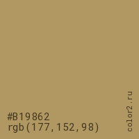 Цвет #B19862 в цветовой модели RGB обозначается тремя октетами (177, 152, 98) в десятичном формате и #B19862 в шестнадцатиричном (hex) формате, которые являются интенсивностью красного 177 (hex B1), интенсивность зелёного 152 (hex 98) и интенсивность синего 98 (hex 62).