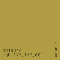 Цвет #B19D44 в цветовой модели RGB обозначается тремя октетами (177, 157, 68) в десятичном формате и #B19D44 в шестнадцатиричном (hex) формате, которые являются интенсивностью красного 177 (hex B1), интенсивность зелёного 157 (hex 9D) и интенсивность синего 68 (hex 44).