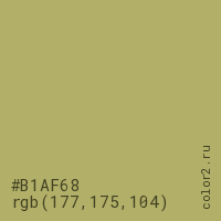 Цвет #B1AF68 в цветовой модели RGB обозначается тремя октетами (177, 175, 104) в десятичном формате и #B1AF68 в шестнадцатиричном (hex) формате, которые являются интенсивностью красного 177 (hex B1), интенсивность зелёного 175 (hex AF) и интенсивность синего 104 (hex 68).