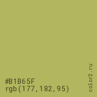 Цвет #B1B65F в цветовой модели RGB обозначается тремя октетами (177, 182, 95) в десятичном формате и #B1B65F в шестнадцатиричном (hex) формате, которые являются интенсивностью красного 177 (hex B1), интенсивность зелёного 182 (hex B6) и интенсивность синего 95 (hex 5F).