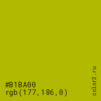 Цвет #B1BA00 в цветовой модели RGB обозначается тремя октетами (177, 186, 0) в десятичном формате и #B1BA00 в шестнадцатиричном (hex) формате, которые являются интенсивностью красного 177 (hex B1), интенсивность зелёного 186 (hex BA) и интенсивность синего 0 (hex 00).