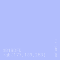 Цвет #B1BDFD в цветовой модели RGB обозначается тремя октетами (177, 189, 253) в десятичном формате и #B1BDFD в шестнадцатиричном (hex) формате, которые являются интенсивностью красного 177 (hex B1), интенсивность зелёного 189 (hex BD) и интенсивность синего 253 (hex FD).