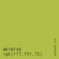Цвет #B1BF48 в цветовой модели RGB обозначается тремя октетами (177, 191, 72) в десятичном формате и #B1BF48 в шестнадцатиричном (hex) формате, которые являются интенсивностью красного 177 (hex B1), интенсивность зелёного 191 (hex BF) и интенсивность синего 72 (hex 48).
