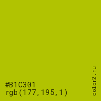 Цвет #B1C301 в цветовой модели RGB обозначается тремя октетами (177, 195, 1) в десятичном формате и #B1C301 в шестнадцатиричном (hex) формате, которые являются интенсивностью красного 177 (hex B1), интенсивность зелёного 195 (hex C3) и интенсивность синего 1 (hex 01).