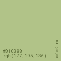 Цвет #B1C388 в цветовой модели RGB обозначается тремя октетами (177, 195, 136) в десятичном формате и #B1C388 в шестнадцатиричном (hex) формате, которые являются интенсивностью красного 177 (hex B1), интенсивность зелёного 195 (hex C3) и интенсивность синего 136 (hex 88).