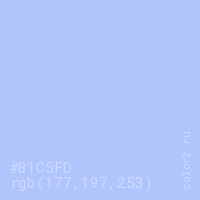 Цвет #B1C5FD в цветовой модели RGB обозначается тремя октетами (177, 197, 253) в десятичном формате и #B1C5FD в шестнадцатиричном (hex) формате, которые являются интенсивностью красного 177 (hex B1), интенсивность зелёного 197 (hex C5) и интенсивность синего 253 (hex FD).