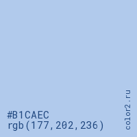 Цвет #B1CAEC в цветовой модели RGB обозначается тремя октетами (177, 202, 236) в десятичном формате и #B1CAEC в шестнадцатиричном (hex) формате, которые являются интенсивностью красного 177 (hex B1), интенсивность зелёного 202 (hex CA) и интенсивность синего 236 (hex EC).