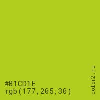 Цвет #B1CD1E в цветовой модели RGB обозначается тремя октетами (177, 205, 30) в десятичном формате и #B1CD1E в шестнадцатиричном (hex) формате, которые являются интенсивностью красного 177 (hex B1), интенсивность зелёного 205 (hex CD) и интенсивность синего 30 (hex 1E).
