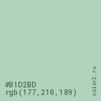Цвет #B1D2BD в цветовой модели RGB обозначается тремя октетами (177, 210, 189) в десятичном формате и #B1D2BD в шестнадцатиричном (hex) формате, которые являются интенсивностью красного 177 (hex B1), интенсивность зелёного 210 (hex D2) и интенсивность синего 189 (hex BD).