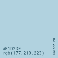Цвет #B1D2DF в цветовой модели RGB обозначается тремя октетами (177, 210, 223) в десятичном формате и #B1D2DF в шестнадцатиричном (hex) формате, которые являются интенсивностью красного 177 (hex B1), интенсивность зелёного 210 (hex D2) и интенсивность синего 223 (hex DF).