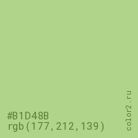 Цвет #B1D48B в цветовой модели RGB обозначается тремя октетами (177, 212, 139) в десятичном формате и #B1D48B в шестнадцатиричном (hex) формате, которые являются интенсивностью красного 177 (hex B1), интенсивность зелёного 212 (hex D4) и интенсивность синего 139 (hex 8B).
