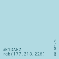 Цвет #B1DAE2 в цветовой модели RGB обозначается тремя октетами (177, 218, 226) в десятичном формате и #B1DAE2 в шестнадцатиричном (hex) формате, которые являются интенсивностью красного 177 (hex B1), интенсивность зелёного 218 (hex DA) и интенсивность синего 226 (hex E2).