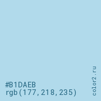 Цвет #B1DAEB в цветовой модели RGB обозначается тремя октетами (177, 218, 235) в десятичном формате и #B1DAEB в шестнадцатиричном (hex) формате, которые являются интенсивностью красного 177 (hex B1), интенсивность зелёного 218 (hex DA) и интенсивность синего 235 (hex EB).