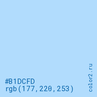 Цвет #B1DCFD в цветовой модели RGB обозначается тремя октетами (177, 220, 253) в десятичном формате и #B1DCFD в шестнадцатиричном (hex) формате, которые являются интенсивностью красного 177 (hex B1), интенсивность зелёного 220 (hex DC) и интенсивность синего 253 (hex FD).