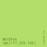 Цвет #B1DF6A в цветовой модели RGB обозначается тремя октетами (177, 223, 106) в десятичном формате и #B1DF6A в шестнадцатиричном (hex) формате, которые являются интенсивностью красного 177 (hex B1), интенсивность зелёного 223 (hex DF) и интенсивность синего 106 (hex 6A).