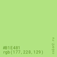 Цвет #B1E481 в цветовой модели RGB обозначается тремя октетами (177, 228, 129) в десятичном формате и #B1E481 в шестнадцатиричном (hex) формате, которые являются интенсивностью красного 177 (hex B1), интенсивность зелёного 228 (hex E4) и интенсивность синего 129 (hex 81).