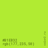 Цвет #B1EB32 в цветовой модели RGB обозначается тремя октетами (177, 235, 50) в десятичном формате и #B1EB32 в шестнадцатиричном (hex) формате, которые являются интенсивностью красного 177 (hex B1), интенсивность зелёного 235 (hex EB) и интенсивность синего 50 (hex 32).