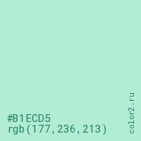 Цвет #B1ECD5 в цветовой модели RGB обозначается тремя октетами (177, 236, 213) в десятичном формате и #B1ECD5 в шестнадцатиричном (hex) формате, которые являются интенсивностью красного 177 (hex B1), интенсивность зелёного 236 (hex EC) и интенсивность синего 213 (hex D5).