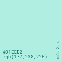 Цвет #B1EEE2 в цветовой модели RGB обозначается тремя октетами (177, 238, 226) в десятичном формате и #B1EEE2 в шестнадцатиричном (hex) формате, которые являются интенсивностью красного 177 (hex B1), интенсивность зелёного 238 (hex EE) и интенсивность синего 226 (hex E2).