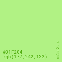 Цвет #B1F284 в цветовой модели RGB обозначается тремя октетами (177, 242, 132) в десятичном формате и #B1F284 в шестнадцатиричном (hex) формате, которые являются интенсивностью красного 177 (hex B1), интенсивность зелёного 242 (hex F2) и интенсивность синего 132 (hex 84).