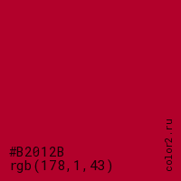 Цвет #B2012B в цветовой модели RGB обозначается тремя октетами (178, 1, 43) в десятичном формате и #B2012B в шестнадцатиричном (hex) формате, которые являются интенсивностью красного 178 (hex B2), интенсивность зелёного 1 (hex 01) и интенсивность синего 43 (hex 2B).